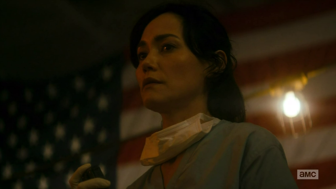 Exner’s character journey into despair was well played, as she eventually euthanized all the patients who couldn’t leave on their own before picking up the bolt gun to follow suit herself. She served as a neat counterpoint to the ruthless Strand, who stopped to pick up his diamond cufflinks from his unfortunate military bribe while the latter was being chowed down on by a zombie. “Kill me,” the soldier begged, to which Strand contemptuously responded, “it looks like you’re well on your way”. If any of the gang are well-suited to surviving this, it’s him.
