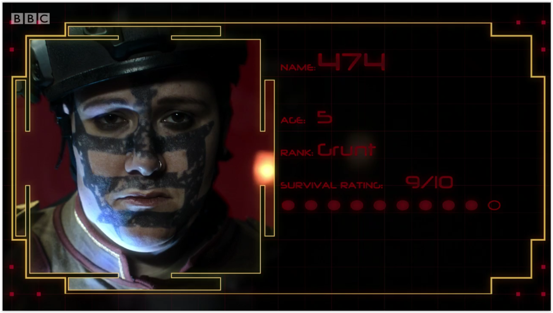 Also on the ethical front (though rather less original), there was some well-expressed disgust (again from Clara) at the idea of the military deliberately ‘breeding’ high-strength, low-intelligence humans purely to be used as expendable weapons. Standup comic Bethany Black gave a marvellously sympathetic performance as ‘Grunt 474’, and one of Gatiss’ better ideas was to split up the characters and pair her off with techno-sceptic Chopra (played well by the genuinely “pretty” Neet Mohan). His thawing towards his artificially created comrade was a good character arc, especially when she actually sacrificed herself to save him. Which didn’t work, sadly.