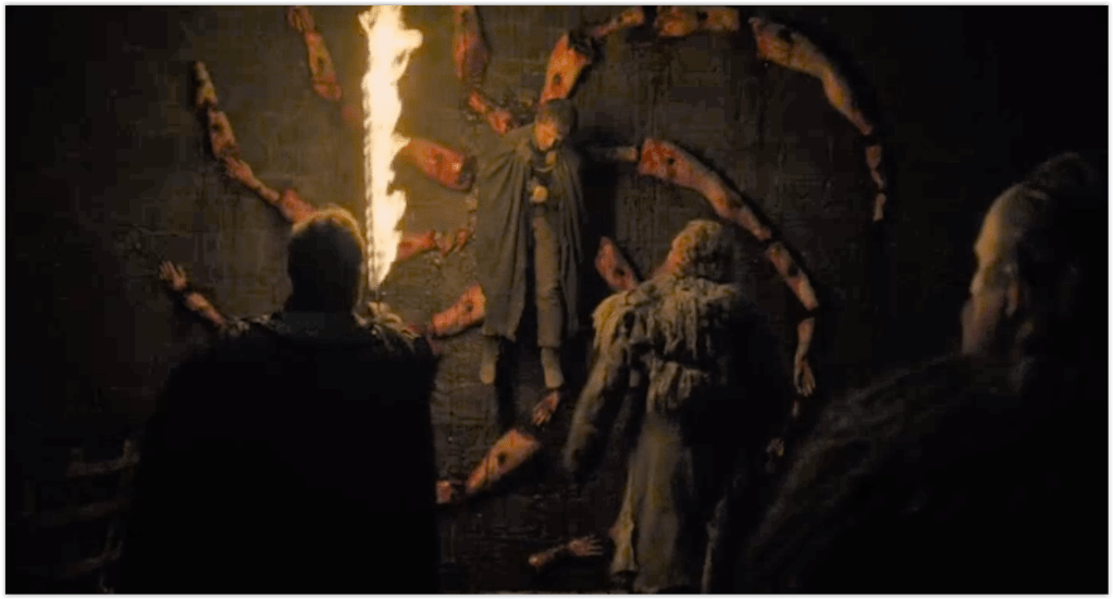 However, the nastiest bit of gore was the discovery of the undead Little Lord Umber, pinned to a wall and surrounded by a spiral of severed limbs. Fortunately for Tormund and Dolorous Edd, Beric Dondarrion still keeps his sword afire…