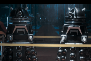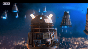I have to say, I actually liked the new Dalek design. Lean and stripped back, it was certainly way better than the oddly proportioned, chubby “rainbow Daleks” that were introduced and then quickly forgotten in the Moffat era. It made sense too, as they were basically reproductions of the wreck of the one from Resolution, explicitly stated to be a specific model – a “reconnaissance Dalek”.