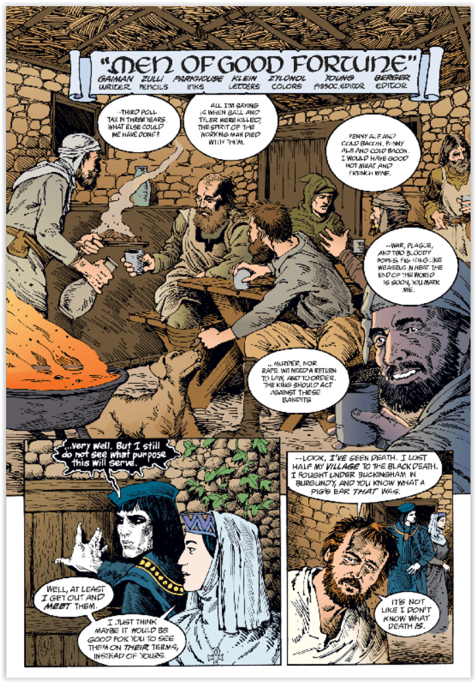 Dream is finally shaken out of his funk by mention of his “ongoing project” – a man called Hob Gadling, who Death agreed to leave alone way back in 1389, and who’s been meeting Dream in the same London pub every hundred years since. At their original meeting, in 1389, he declared death to be “a mug’s game” – and so Dream’s sister agreed to leave him alone to see what would happen. Cue an equally pitch-perfect adaptation of Men of Good Fortune, a series of vignettes showing their meetings once a century, as in the comics.