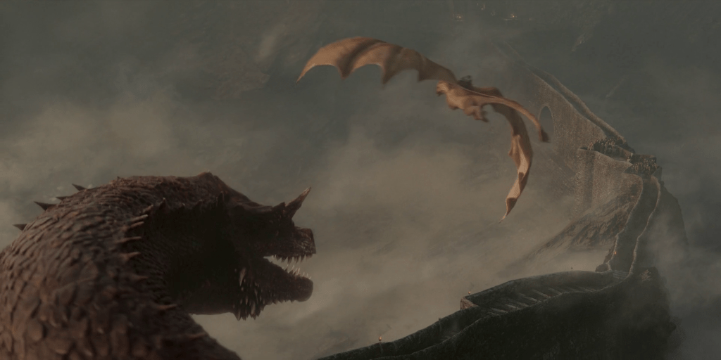 Of course you couldn’t have a show about the Targaryens without dragons, and the ep’s final confrontation at Dragonstone gives us two. Plainly Ser Otto overestimates his persuasive powers in hoping to talk Daemon out of occupying the ancestral seat and marrying his courtesan, as the looming threat of Daemon’s dragon shows. But then, Daemon doesn’t reckon on his niece showing up with a dragon of her own.