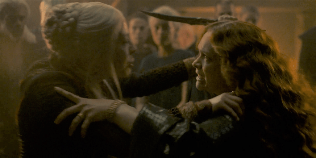 Rhaneyra too has matured into a more skilled schemer, but become a less sympathetic character as a result. Her earlier rebellions against that all-important Royal Duty seemed grounded in a sense of fairness and justice; here, she’s prepared to marry her uncle, have her husband killed, and betray her Queen. Not out of any sense of justice, but purely out of pragmatic self-advancement. And of course self-preservation – as we see this ep, arch-rival Queen Alicent is more than capable of killing her personally if the opportunity arises.