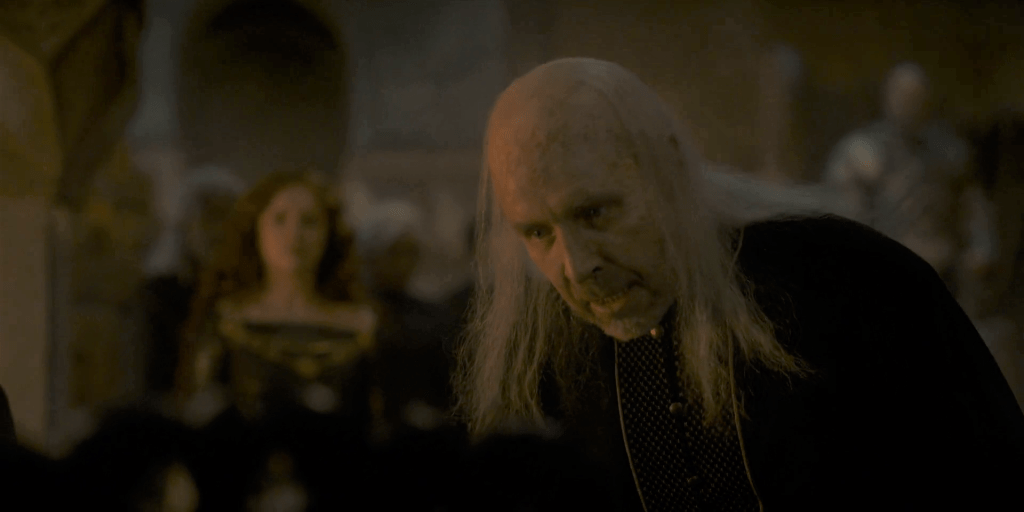 Ah, Viserys. I’d say his utter blindness to the events engulfing his family are implausible, if not for plenty of historical evidence of kings wilfully ignoring just that – the Anarchy, the 12th century civil war this is all based on, started exactly that way. Viserys is clinging on despite what appeared to be a pretty serious case of TB ten years previously, but judging by his state at the end of this ep, he can’t be longer for the world. And I’m guessing that his death will be the trigger for all out war.