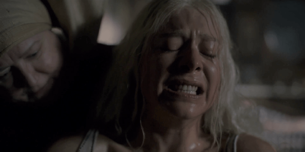 And that’s a birth that went OK. For one that didn’t, later in the ep we saw the new, older Laena Targaryen (nee Velaryon) have labour complications so severe Pentos’s best medics couldn’t even save the child, much less the mother. It’s a shame not to have seen more of Nanna Blondell, who impresses as the older Laena, but she chooses to die more quickly by dragon self-immolation. Ouch.