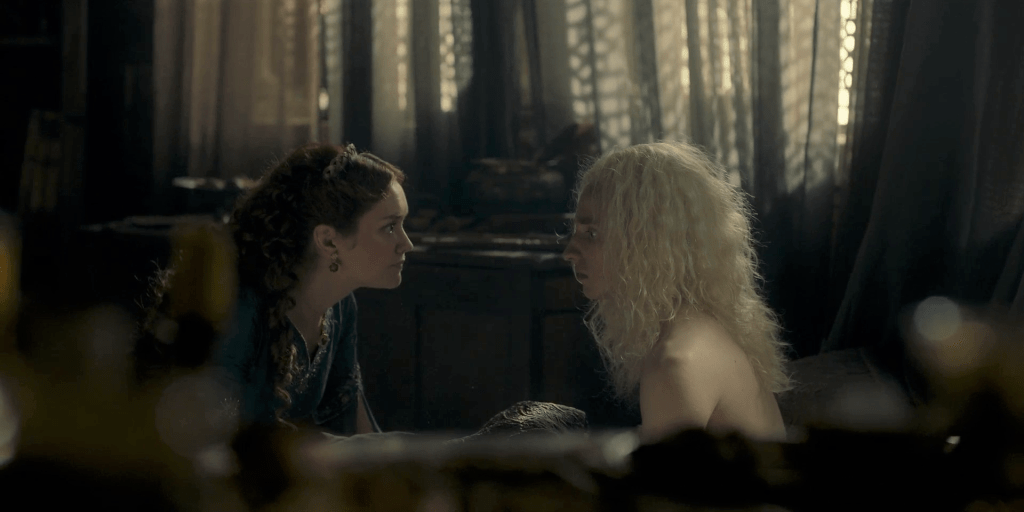 Thus it is that Allicent, well aware (like most of the court it seems) of the sham nature of Rhaenyra’s marriage, keeps needling about the parentage of Rhaenyra’s three children. Children that, very obviously, are not fathered by the effete Ser Laenor, but Kingsguard Captain Harwin Strong, son of King’s Hand Lyonel and brother of clubfooted schemer Larys (it’s getting easier to keep up with who’s related to who by this point). “Keep trying Ser Laenor,” Allicent smiles sweetly, “one day you may get one who looks like you.”