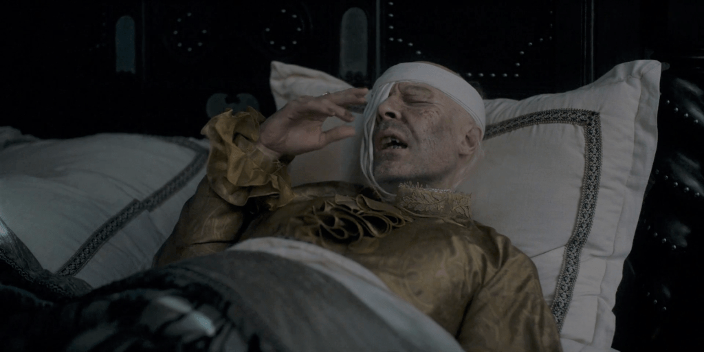 This is the episode that shows us what Considine’s performance has been building to throughout. He’s been content to let Matt Smith hog the limelight till now, but this is Viserys’ episode through and through. Reduced to a frail husk of a man by his wasting illnesses, sidelined and drugged by his ambitious wife and scheming Hand who rule in his stead, he could easily have come across as simply pathetic – as indeed he does when we first see him barely aware in bed.