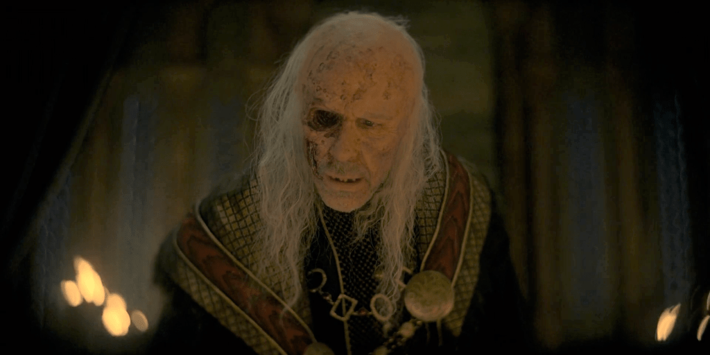 Viserys has throughout appeared at best a rather ineffectual King, but trying his best to be a decent man. He’s no firebrand, but he’s aware of the responsibilities of being a King – perhaps too aware, as his interminable lectures on Royal Duty have shown. It’s not been a showy part up till now, which made me wonder why a great actor like Paddy Considine was interested in taking it (“The money” did spring to my cynical mind).