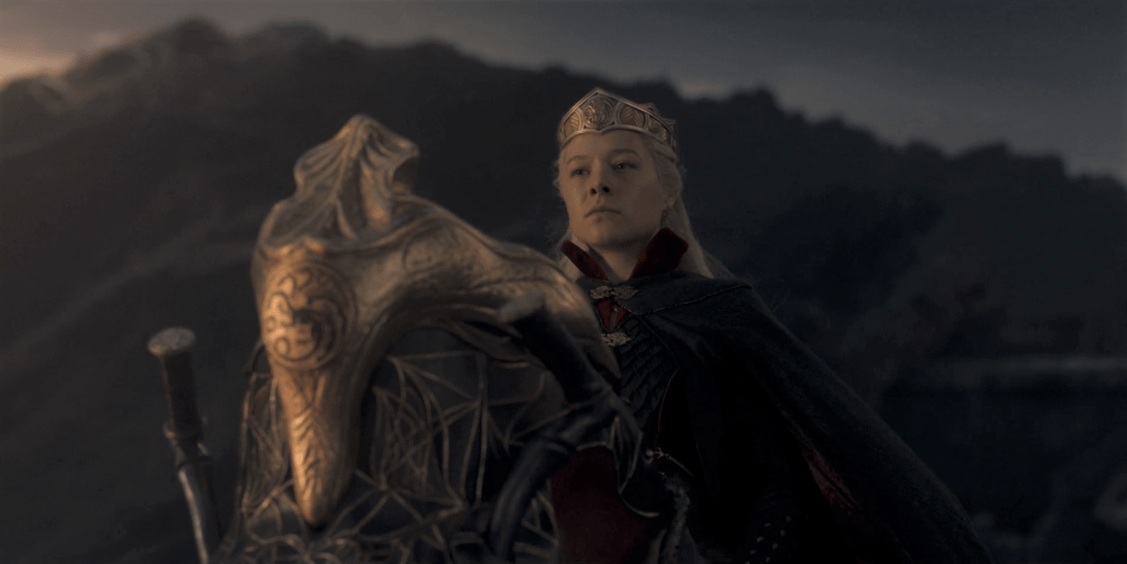 Whichever Cargyll it is, it serves to illustrate a split in the Kingsguard (Queensguard?) too. We’d seen a fair few of them decamp to Dragonstone with Daemon earlier on in the season. Now, Matt Smith gets another chance to be at his most chilling, as he presents them with an ultimatum – loyalty to Rhaenyra (and of course him) or a quick death. The point was reinforced by the looming presence of Daemon’s dragon, but really, it didn’t need to be – Smith’s glowering presence was more than menace enough. He’s consistently been the best thing about this show (Paddy Considine’s last ep aside), and will presumably continue to be in the already-confirmed second season.