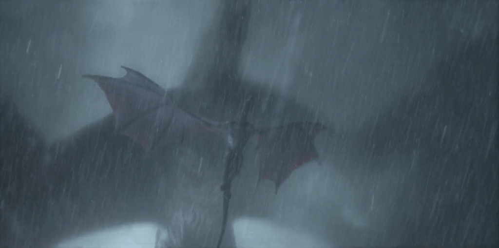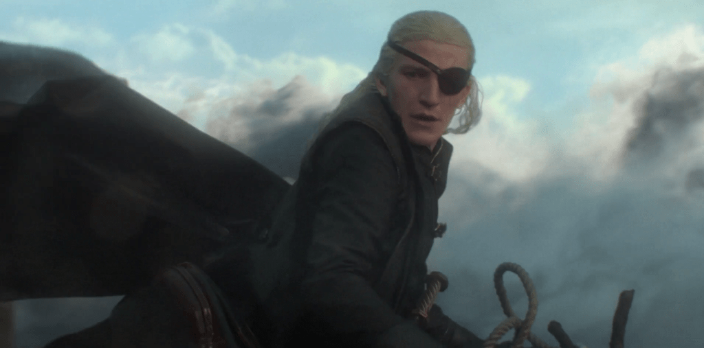 The outcome’s never really in doubt. Arrax is a tactical nuke compared to Vhagar’s ICBM. I did wonder how they would deploy the usual fire in that torrential rain, but as it turned out, Vhagar doesn’t need to. Incensed by a feeble (uncommanded) attack from Arrax, he simply bites the smaller dragon in half, sending its young rider to a presumed inevitable doom. This plainly is not the result Aemond wanted; Ewan Mitchell’s face is a picture at the sight, and the picture says, “oh shit”. He’s claimed first blood, and in effect started the war. His mother is not going to be happy.