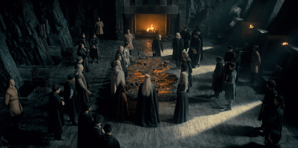 I had wondered last time as to the meaning of the ep title, The Green Council. Well, with this ep and its title I wonder no more. It seems that the faction supporting the succession of Aegon are now known as ‘the Greens’, while as of now, Team Rhaenyra are ‘the Blacks’. It’s a handy shorthand I guess, but nothing in the dialogue indicates when this started or why each colour was assigned; Rhaenyra just starts referring to her opponents thusly with no explanation, while other meeting participants nod sagely instead of asking her what she’s talking about.