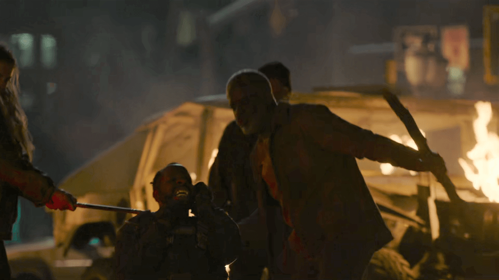 There’s also that unfeasibly giant one who must surely have been an end of level boss in the original game. Distressingly immune to bullets, his ripping off of the faithful Perry’s head is shown almost as a background detail rather than in our faces. It’s a nice directorial choice to bury it in the melee rather than foreground it.
