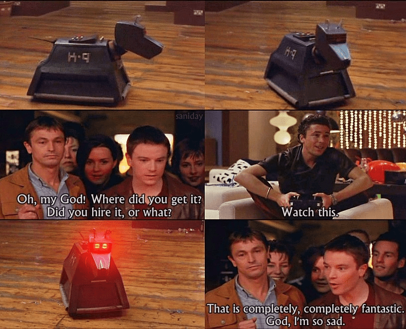 Fortunately, some of those nerds had now become rather important television writers, and it showed in their work. Russell T Davies in particular put his love of the show front and centre in his equally influential (to me) 1999 classic Queer as Folk, with one of the protagonists a hardcore fan just like me, and a major plot point being whether his then-boyfriend could name all eight Doctors, like his best mate could.