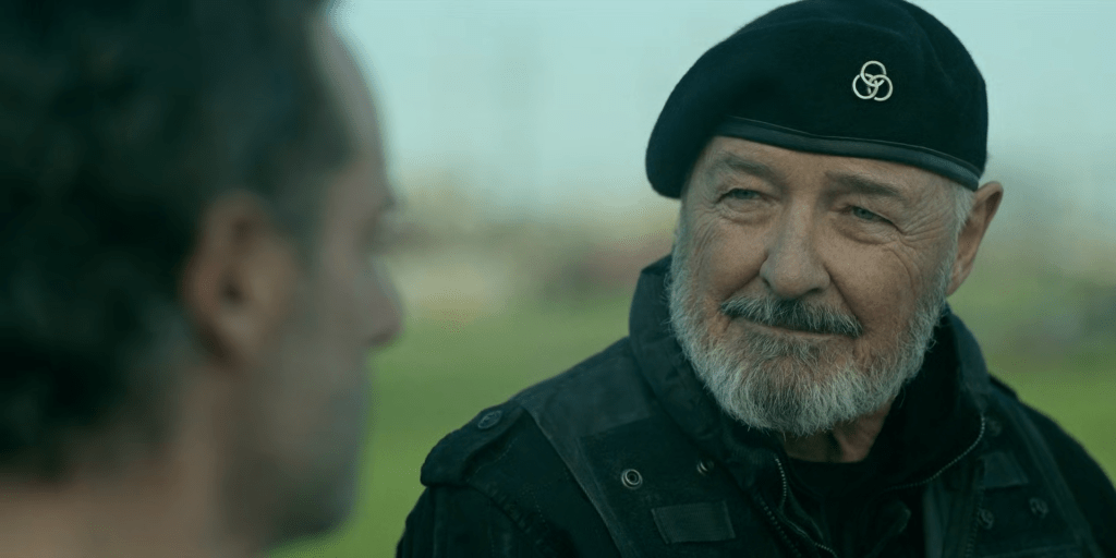 To be fair, we do have inklings of a plot even here. CRM Lt Col Okafor (a nicely intense Craig Tate) is haunted by memories of his bombings of Atlanta and Los Angeles (represented by the relevant clips from TWD and Fear), and wants to topple what is clearly a totalitarian military dictatorship. To that end, he’s recruiting recidivist prisoners like Rick and South African sailor Thorne to the ‘higher echelon’ of the CRM, in what’s clearly a Stauffenberg-like plot to assassinate the Republic’s own Hitler, Major General Beale. Beale, who was mentioned frequently but never actually seen in World Beyond, is incarnated here by veteran character actor Terry O’Quinn, a standard go-to for this kind of role. O’Quinn, still fondly remembered for his charismatic turn as Locke in Lost, is as good as ever in his one meaty scene, obliquely threatening Rick as they sit tensely together on a bench overlooking the river.