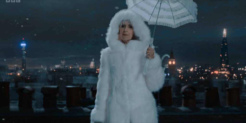 That last seems to have annoyed viewers more than any other point, including, initially, me. Why make such a big deal of a plot point if you’re not going to resolve it? But actually, having now rewatched it, I think the answer to that one is still to come. The coda for the ep, and indeed the season, showed us the now unabashedly evil Mrs Flood standing on the roof, smiling sweetly as she talked of the Doctor ending in “absolute terror”. While, notably, it was snowing all around her.