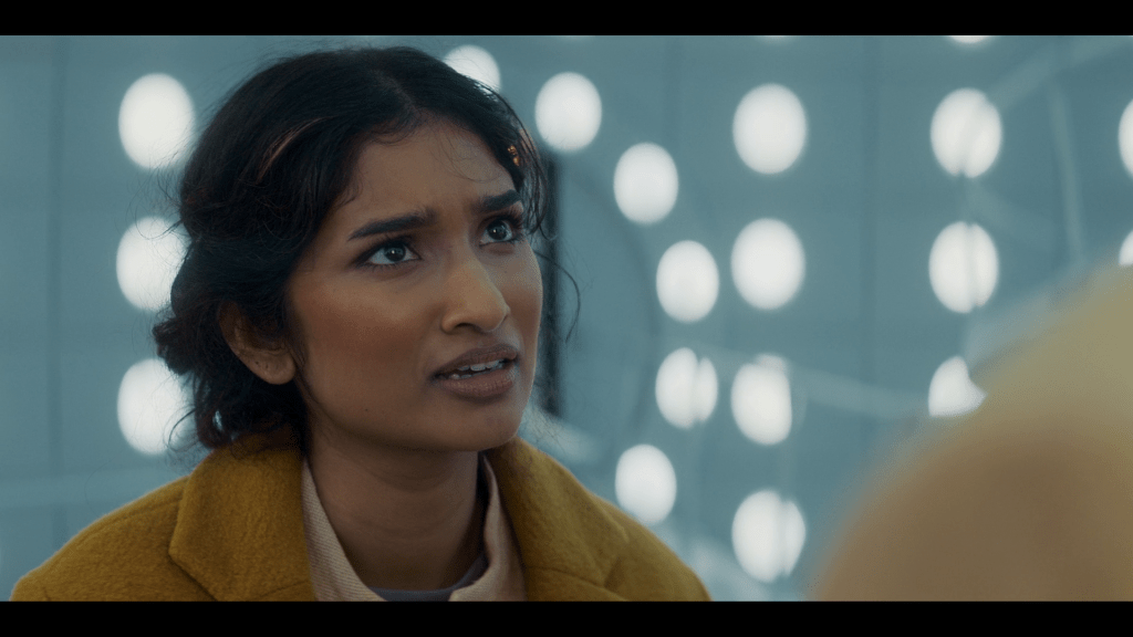 But the main talking point of the ep was of course the introduction of new companion Belinda Chandra. Varada Sethu, so impressive in last season’s Boom, was as good here as there, as a totally different (but connected) character. Belinda was established from the start as a selfless, competent nurse, which was nicely followed up on as she immediately took charge of the rebels’ underground infirmary. She plainly has a very strong conscience, being willing to sacrifice herself to save the planet that bore her name, but she’s also smart enough to follow the Doctor’s lead in defeating the “AI Generator” that turned out to be her abusive ex.