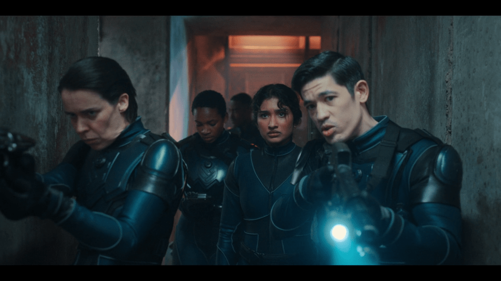 Irish actor Caoilfhionn Dunne (it’s pronounced “kweelin”) did well with one of only about three of the troopers that weren’t written as disposable redshirts. Davies’ script economically gave Shaya a good backstory that was nicely referenced as she raced to her doom, while also portraying her as a ruthless soldier when she needed to be – see her clever dispatch of the mutinous Cassio. The only other trooper who got (at least a bit of) depth was Bethany Antonia’s sympathetic Mo; which was vital for that ambiguous cliffhanger ending suggesting that the monster may not be as dead as we thought.