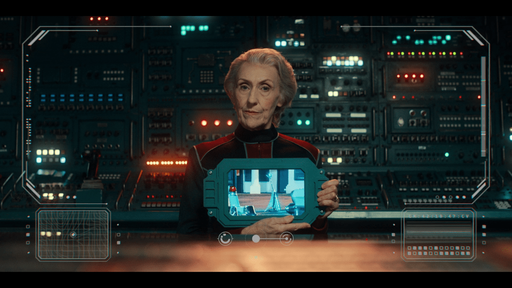 Here, as there, we saw extensive use of British Sign Language to communicate – nice to see that the collaboration with Disney didn’t result in using the quite different American Sign Language. Of course, the Doctor was fluent, and apparently Ncuti Gatwa actually learned BSL for the episode. Belinda wasn’t, which led to the nice throwaway line that, in this future, it’s illegal to be a nurse without the ability to sign. Good to see that even in the current climate of culture wars, RTD evidently still has some optimism about the future. Even the hardcore, tough-as-nails space marines had a nifty device to visualised their speech as words on a holographic screen, showing that they too had the deaf in mind.