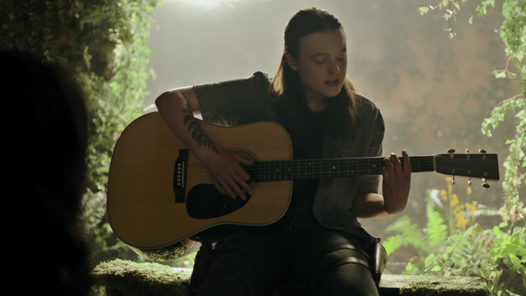 OK, it was pretty lucky that she found a well-preserved guitar packed in a case with those familiar moisture-absorbing packets. But that led into a scene which was undoubtedly one of the ep’s highlights, as she basically serenaded Dina with an achingly beautiful acoustic rendition of A-Ha’s ‘Take on Me’. Apparently that really was Bella Ramsey, an accomplished guitar player, both playing and singing. It was also, I gather, a faithful reproduction of a well-remembered scene from the game.