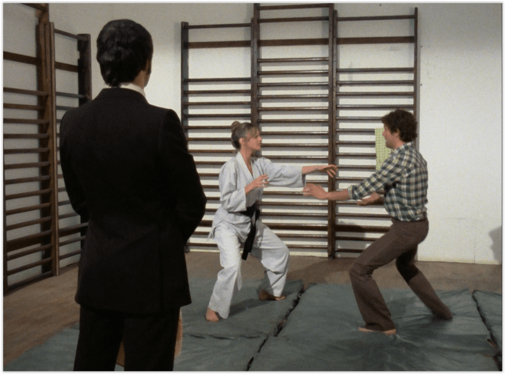 There’s a gag plot early in the ep in which the boys compete to date a new CI5 employee, who isn’t even dignified with a character name – she’s simply credited as “Girl in Gym”. Which is where Bodie and Doyle first encounter her, practising kung fu (very popular in 1977, thanks to a certain Bruce Lee).