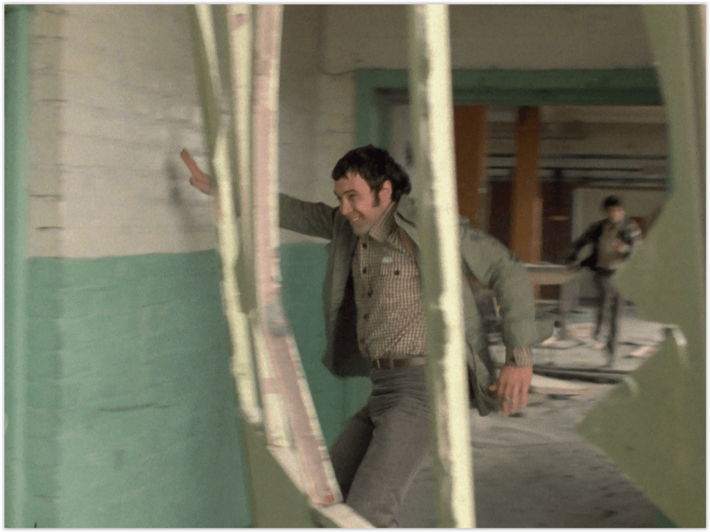 But Ramos still has one ace up his sleeve, in the form of his unfortunate hostage, who’s currently tied up in a building that’s in the process of being demolished. Cue Bodie and Doyle (or some stuntmen who look vaguely like them) frantically running around a collapsing factory rather than. say, asking the workmen nicely to stop knocking the building down. Well, that would have robbed us of an action sequence, of course.