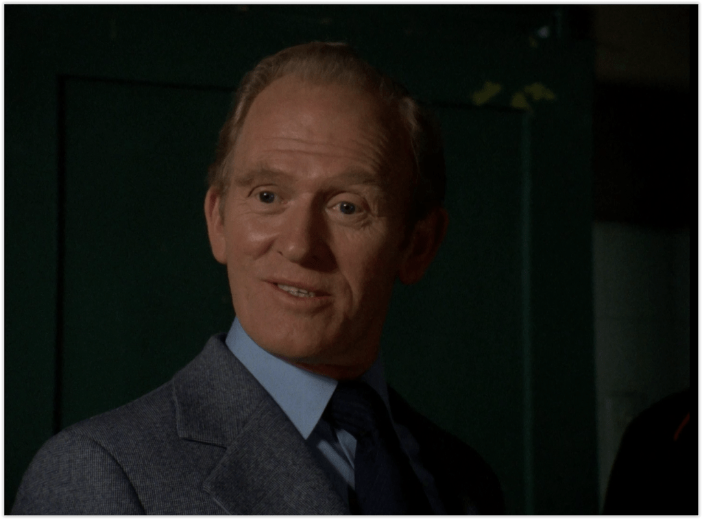 Outside of the gang, it’s none other than the magnificent Geoffrey Palmer as smooth, urbane crime boss Simon Sinclair. Palmer, a fine actor in both comedy and drama, has too many credits to list, including at least three roles in Doctor Who; however, he may be best remembered for his comedy roles in The Fall and Rise of Reginald Perrin and Butterflies.