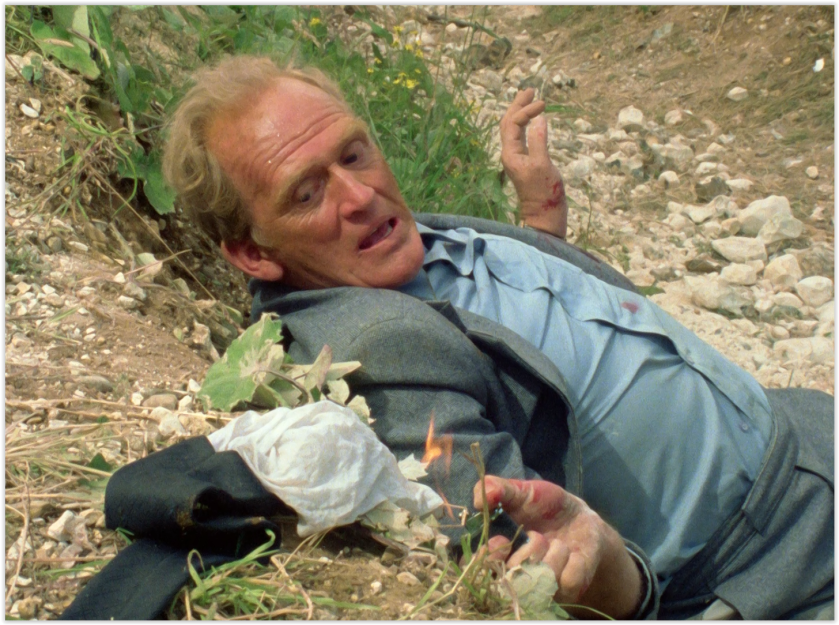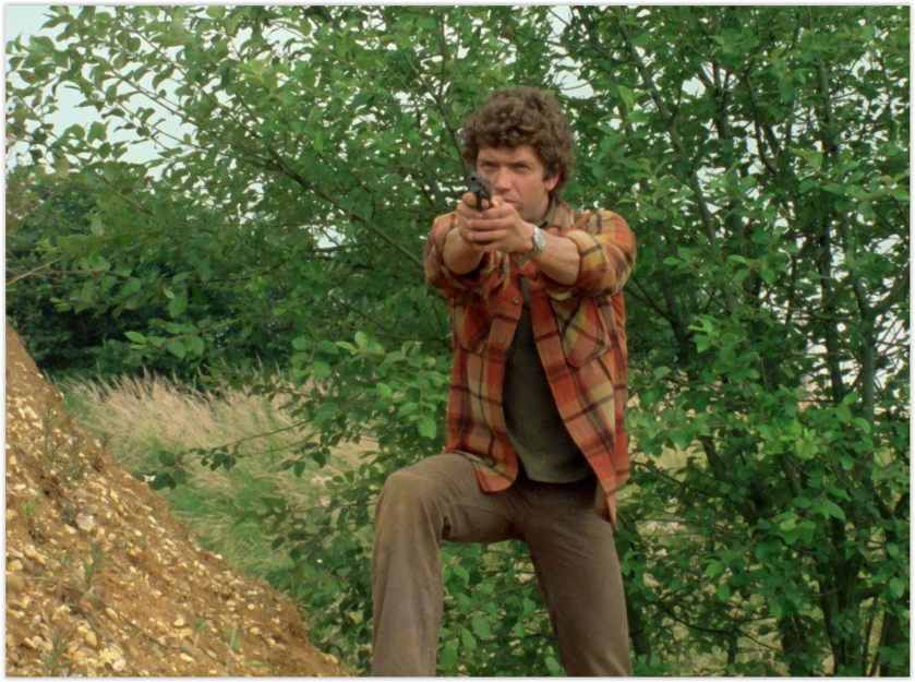 The budget must have been amped up for this one, as the first quarter of the ep is a lengthy action sequence in which mercenary leader Krivas and his motley crew storm a bank with machine guns, then pile into a stolen RAF truck for a gunfire heavy car chase with the police, then steal a plane to escape. As Bodie and Doyle listen to the radio chatter in Cowley’s office, a squadron of RAF Harriers (in some quite decent stock footage) is scrambled to pursue the plane, which dodges into a nearby cloud while, unseen, the mercenaries parachute out leaving the stolen plane to crash into the ground (that last bit isn’t actually shown – the budget wasn’t that high).