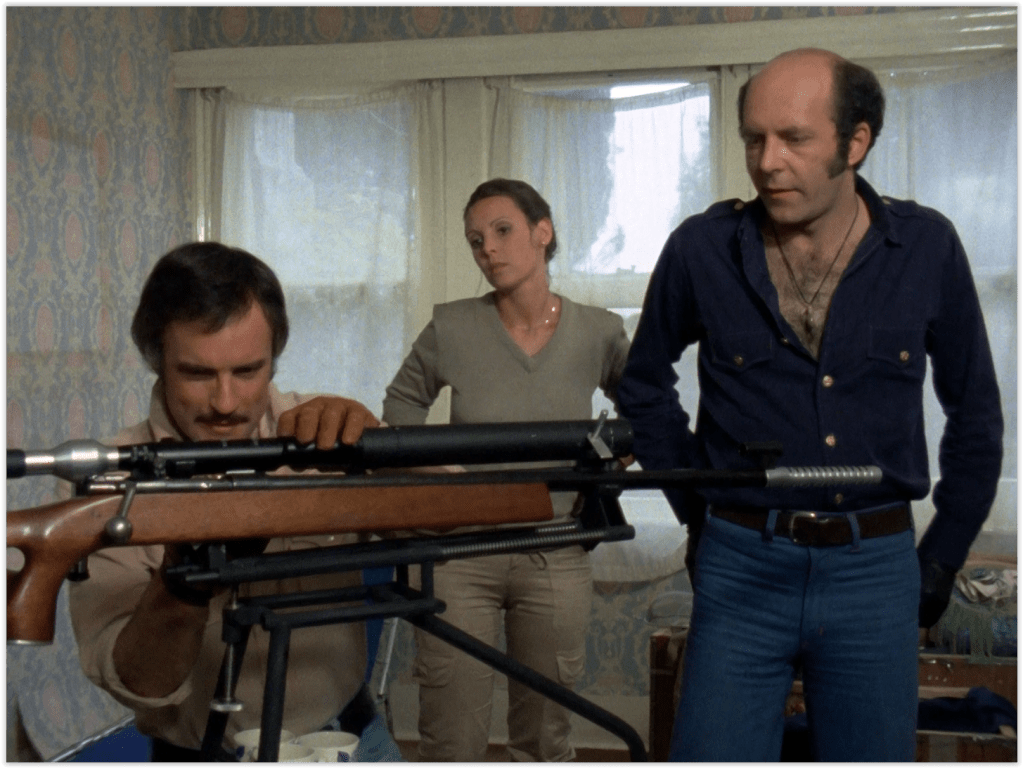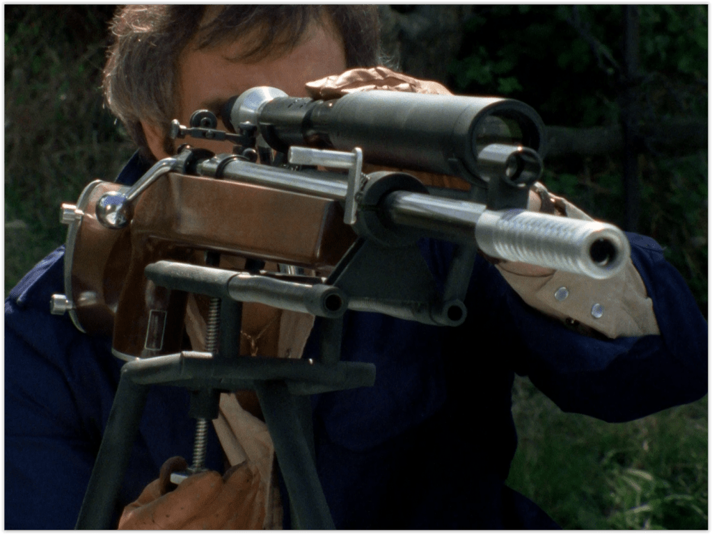 Being such a special gun, most of the episode dwells on Georgi’s attempts to calibrate it before taking on the job by shooting random scarecrows and golfers at enormous range. Amusingly, having hit a scarecrow at two miles distance, he then singularly fails to hit an unfortunate witness about ten feet in front of him, which is how CI5 get clued in to the fact that something’s going on. Well, that and the fact that Georgi’s trigger happy client has already shot a traffic cop (with a more normal sawn off shotgun) less than an hour after Georgi arrives in England.