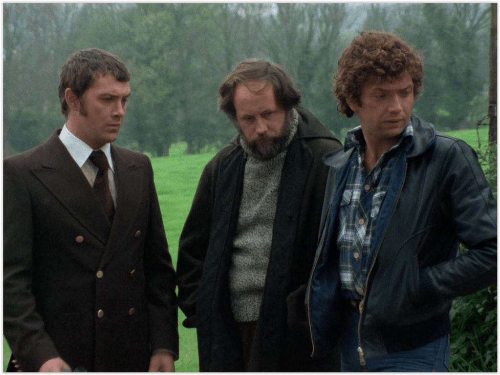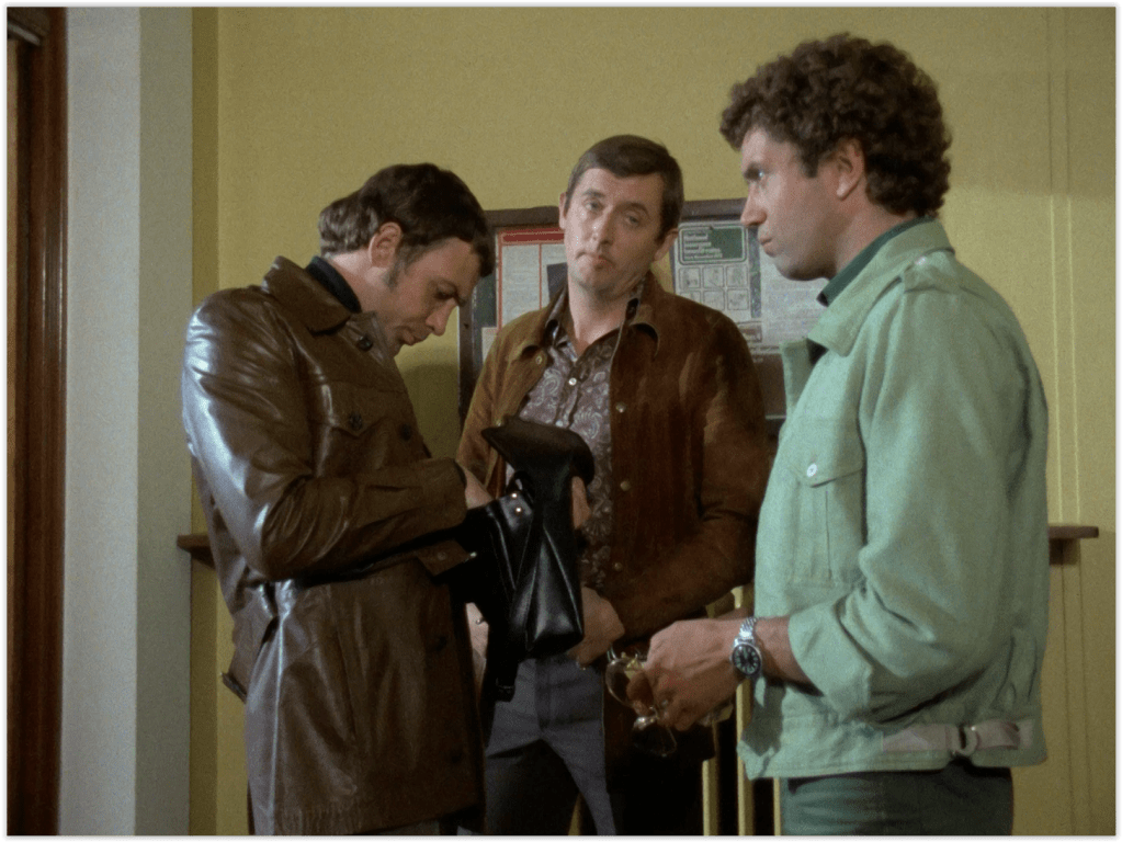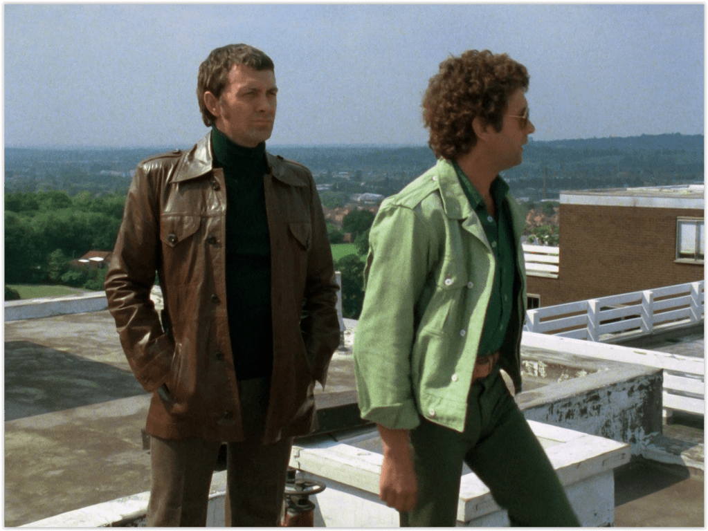 Apparently one shade of green isn’t enough for him though, as later in the episode he combines the jacket with differently shaded green flares and shirt, giving him the look of a man cosplaying Mr Toad. While Bodie, ever the fashionista, inevitably switches to his beloved leather with a belted brown safari jacket, over one of his huge collection of rollneck sweaters.