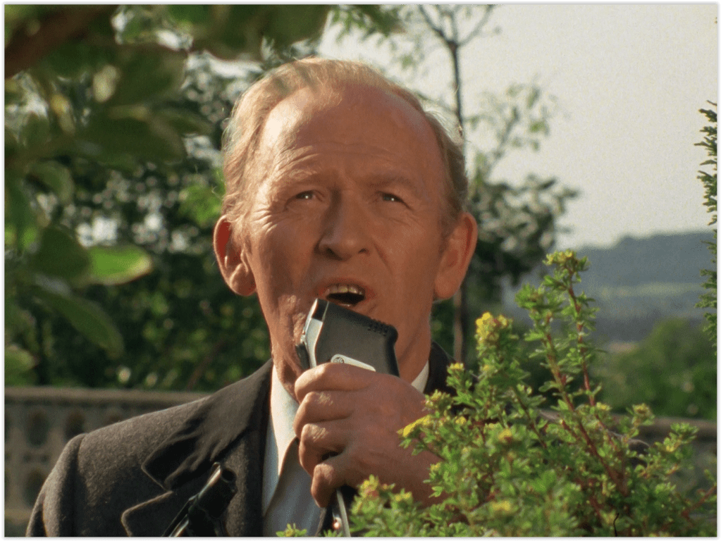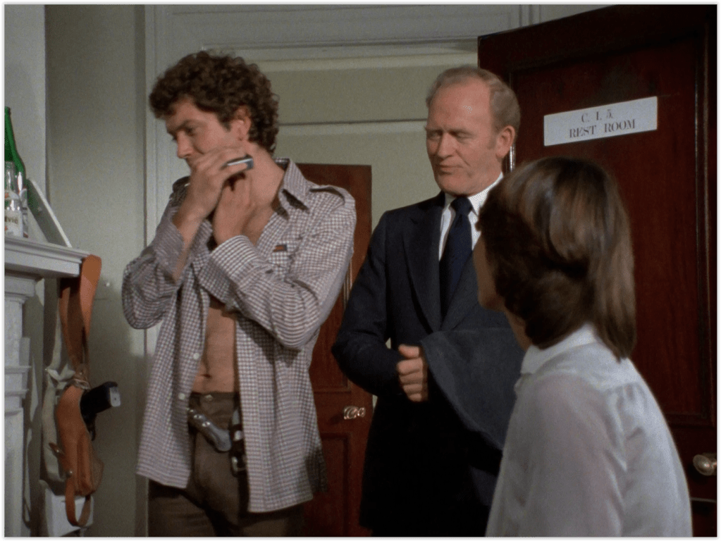 Doyle, having slept in the CI5 office all night, is seen shaving with an incredibly noisy 1977 electric shaver, while tantalisingly displaying his hairy chest to Cowley’s secretary (and indeed Cowley).