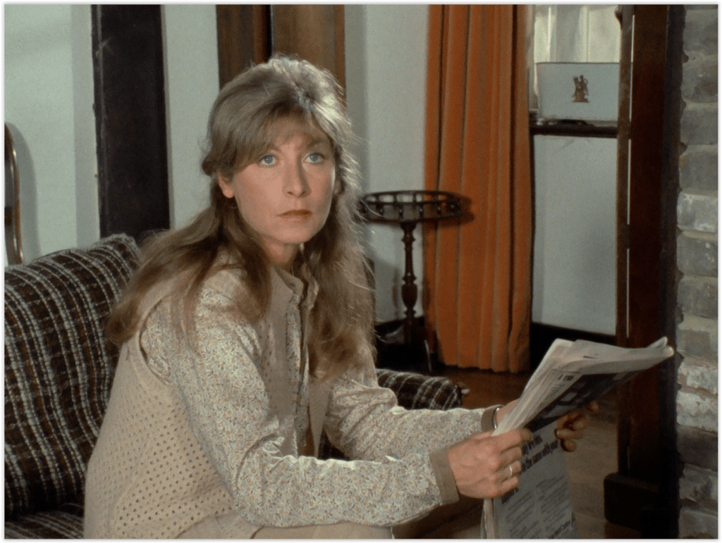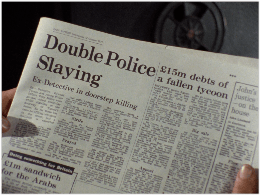 Ann Berry is seen reading another of the show’s mocked up newspapers in the aftermath of Turner’s killing – as before, the new HD transfer allows you to see what the actual text is below the plot-relevant headline. Ironically, it’s about a proposed strike at British Leyland, curiously mashed up with a story about a young man’s death in a motorcycle accident.