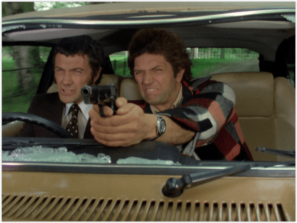 We do at least get a bit of a car chase in between all the filing, as when the boys arrive at Berry’s place in their shiny new car, the hitman is just leaving. Cue much tyre squealing through the countryside and shooting through a broken windscreen that is momentarily thrilling… but then it’s back to the files.
