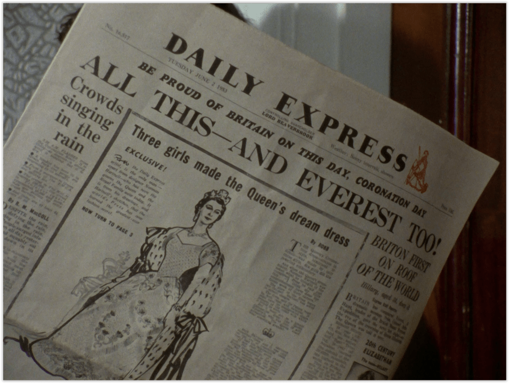 And not so much a 1970s reference as a 1950s one – that’s an authentic copy of the Daily Express from 02 June 1953 we see at various points throughout the ep.