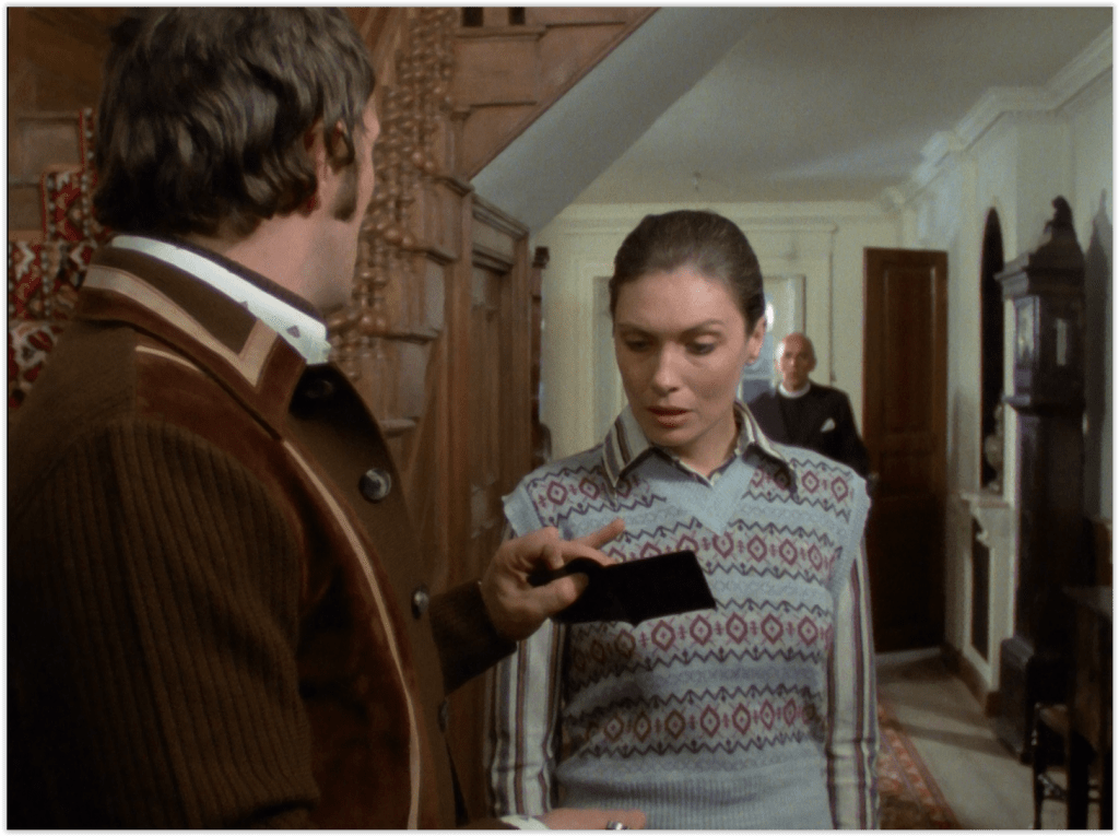 Although Bodie is once again back in his beloved leather (the jacket with the huge pocket zips), it seems that he wears different materials when he’s on holiday. Specifically, a tight cardigan with enormous lapels in that most 70s of colours, brown. Given the plot of the episode, for once he doesn’t get to change his clothes several times an episode.