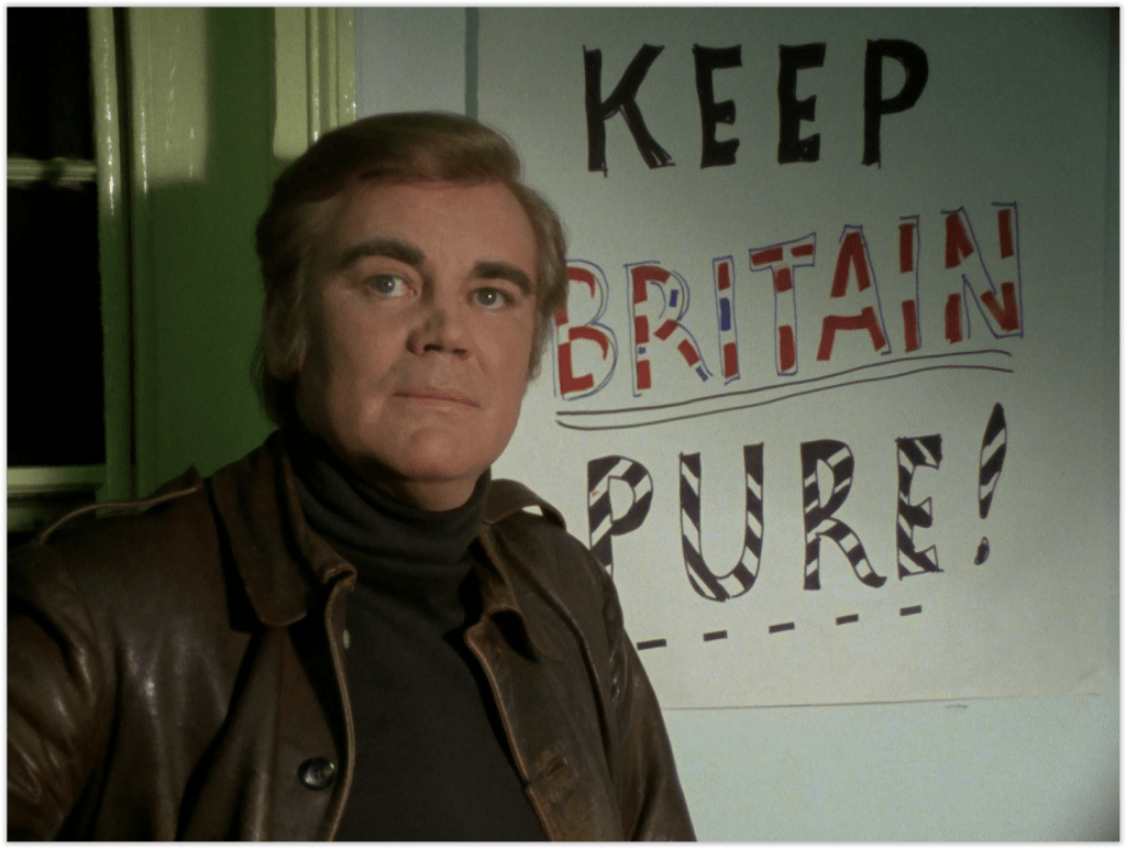 The ostensible villains of the piece, the ‘Empire Society’, are once again blatantly based on a real organisation. In this case, it’s the National Front, a far right, white supremacist group who at one point in the mid-70s, became the fourth most popular political party in the UK. Funny how history repeats itself. Or frightening, perhaps.