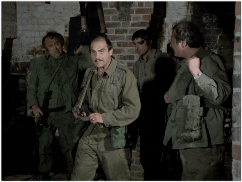 The budget must have been amped up for this one, as the first quarter of the ep is a lengthy action sequence in which mercenary leader Krivas and his motley crew storm a bank with machine guns, then pile into a stolen RAF truck for a gunfire heavy car chase with the police, then steal a plane to escape. As Bodie and Doyle listen to the radio chatter in Cowley’s office, a squadron of RAF Harriers (in some quite decent stock footage) is scrambled to pursue the plane, which dodges into a nearby cloud while, unseen, the mercenaries parachute out leaving the stolen plane to crash into the ground (that last bit isn’t actually shown – the budget wasn’t that high).
