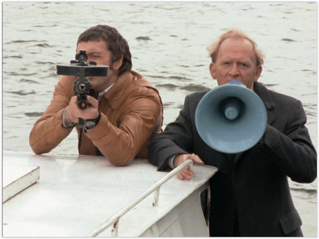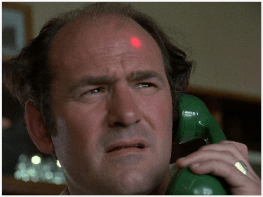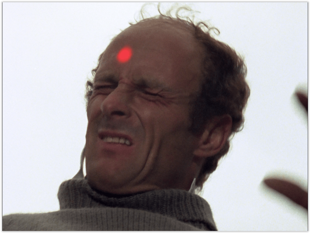 The laser sight was something new though. While we’re now used to the familiar red dot on someone indicating that a gunman has a bead drawn on them, this had obviously never been seen before when this ep had made, leading to some interesting ideas about how it worked. As Cowley predicts, it has become an incentive to surrender just to see that red dot on yourself; less certain, however, is his assertion that it can be used to temporarily blind an opponent, as we see in the pre-credits sequence. And even less likely is the direction’s implication that targets can actually feel the thing – several people are seen to rub or scratch themselves where the dot appears.