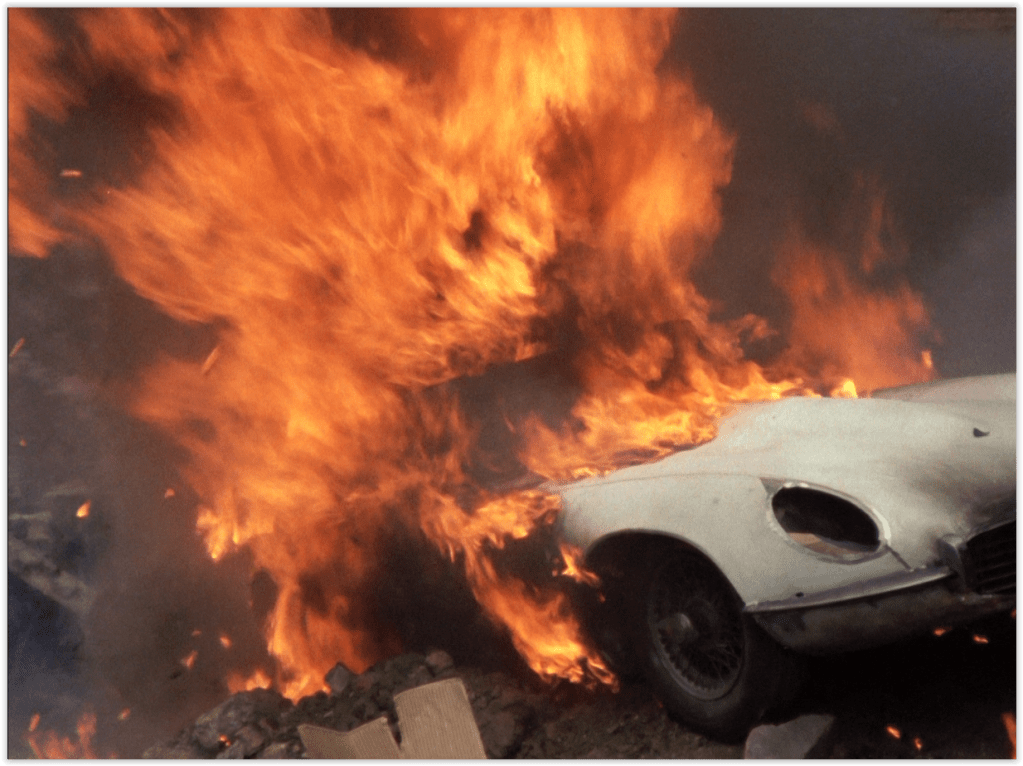 Bodie’s gentle ribbing about “that old thing” suggests he’s had it for a while, but this is the first we’ve seen of it. E-Types were instant classics and never reached the cheap ‘banger’ stage, so the one we see blown up is clearly a mock up made from bits of scrap rather than the actual one Doyle has been driving.
