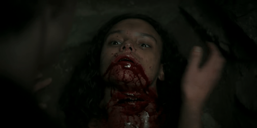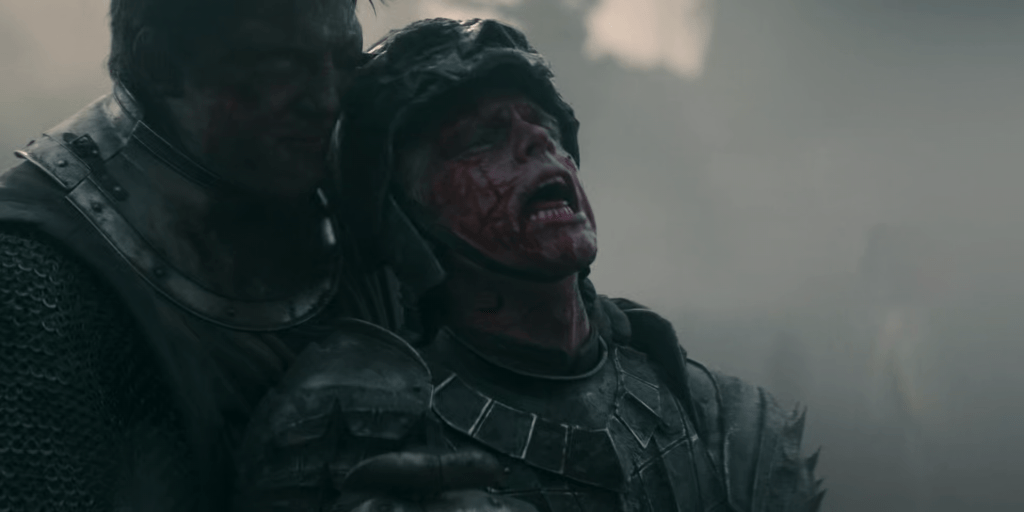 Dunk is, of course, a very big man. But even so, the punishment he takes during the fight is so extreme that it’s easy to believe he might not make it through. He gets impaled by a lance right at the start, then stabbed with a dagger, repeatedly hit in the head by a mace, stabbed again through his helm’s eyeslit, and brutally beaten by the vengeful Prince Aerion. All credit to Peter Claffey (and the makeup artists) for making you believe just how painful all this would be – small wonder that Aerion is so eager to prematurely claim his opponent’s death.